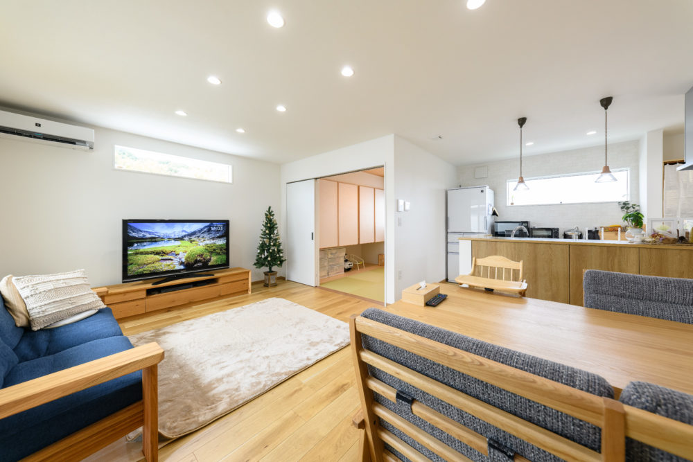 こだわりのポイント広い空の下に、一際目を引く片流れ屋根の真っ白な外観。塗り壁の外観はご家族のこだわりポイントのひとつ。外観と調和した、白×ナチュラルを基調とした室内は寒空の下でも温かみをかんじる。リビング脇の3畳の和室は現在はキッズスペースとして大活躍。寝かしつけが終わった後は、あたたかいリビングで夫婦の時間を過ごすことが多いという。 家の特徴吹き抜け / 大型収納 / 自然素材 / 中庭 / セカンドリビングライフスタイル共働き / 子育て Back page 一覧へ戻る Next page